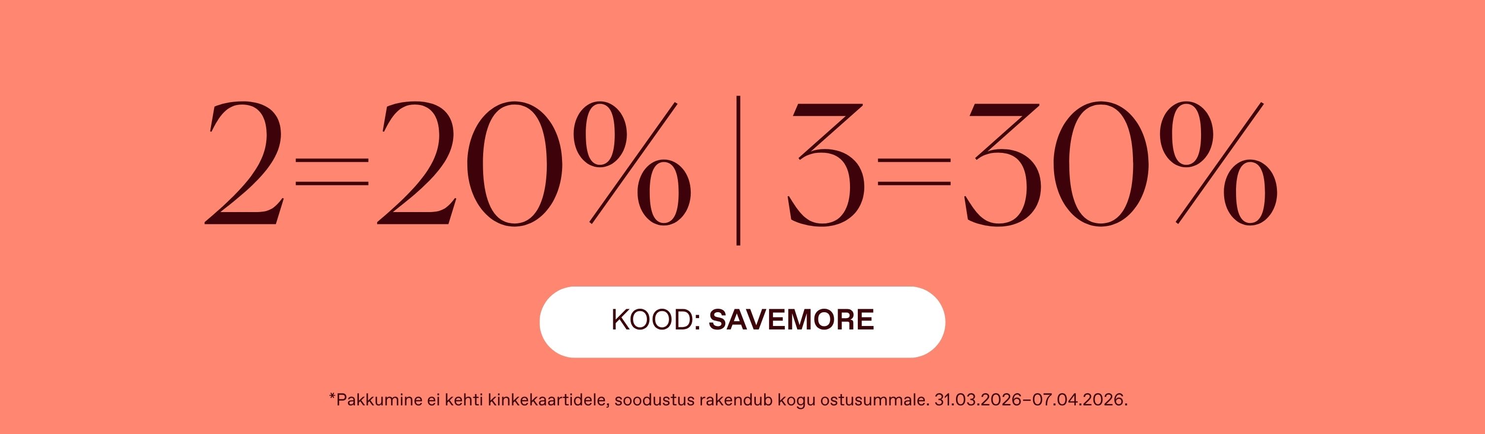Osta 2 – saa -20%, osta 3 – saa -30% | kood:  {coupon}